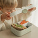 A lancheira com divisórias é muito útil para transportar os almoços ou lanches das crianças quer nos dias de escola, ou em passeio. Os 3 compartimentos mantêm a comida separada, tornando-se mais simples para identificar os alimentos, e o garfo de pequenas dimensões ajuda na hora de comer fora de casa. Simples de limpar e com as dimensões perfeitas para ser arrumada quer na mochila da mãe, quer na dos mais pequenos.