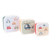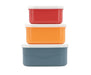 Conjunto de três caixas com tampa, com cores e ilustrações diferentes, para levar para todo o lado. Cada caixa tem um tamanho diferente e podem ser guardadas umas dentro das outras. Ideais para transportar alimentos separadamente, numa mochila ou lancheira