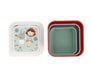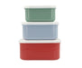 Conjunto de três caixas com tampa, com cores e ilustrações diferentes, para levar para todo o lado. Cada caixa tem um tamanho diferente e podem ser guardadas umas dentro das outras. Ideais para transportar alimentos separadamente, numa mochila ou lancheira