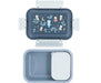 Ideal para levar pequenas refeições e/ou snacks para a escola ou para um passeio, a caixa lancheira "bento", da Tutete, com tampa hermética inclui um garfo e uma caixa mais pequena, amovível, no interior, para transportar vários alimentos, sem os misturar. Os seus 4 fechos são muito fáceis de abrir e fechar para os mais pequenos, para que possam utilizá-la sozinhos.