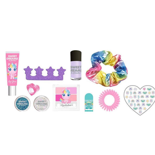 O conjunto de beleza Sweet Dreams inclui uma variedade de produtos de maquilhagem e acessórios de cabelo para um visual divertido.