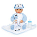 A pequena Benno adora cachorros! Esta boneca usa um gorro com orelhas caídas e um macacão azul e branco com um desenho. Inclui manta e biberão de brincar.