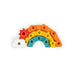 Brinquedo de arco-íris para criar diferentes composições, de acordo com a imaginação ou seguindo os cartões ilustrados. Com pinos diferentes para se familiarizar com formas e cores primárias: estrelas, gotas de chuva, meia-lua e círculos em vermelho, azul e amarelo.