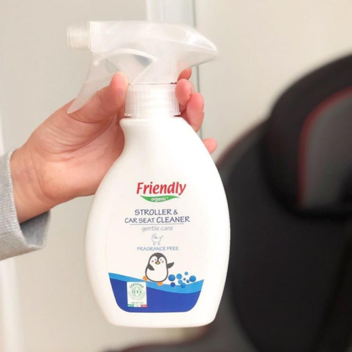 Detergente da Friendly Organic eficaz na limpeza e eliminação de manchas em cadeiras-auto e carrinhos de bebé.