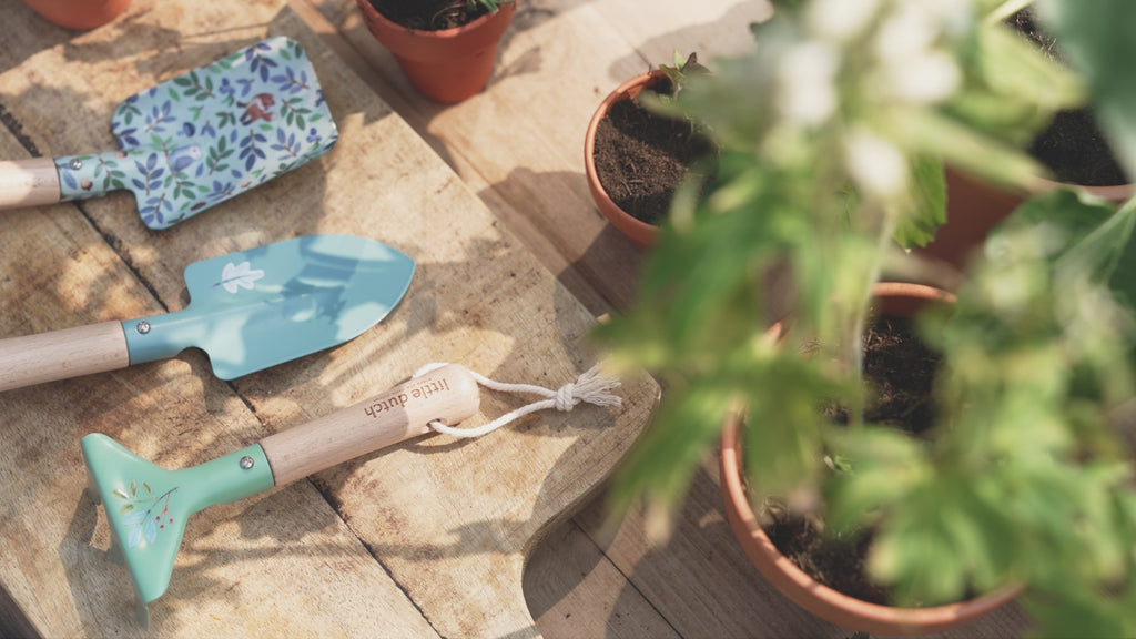 Para pequenos jardineiros, o Conjunto de Ferramentas de Jardinagem Forest Friends, da Little Dutch, composto por duas pás e um ancinho, é resistente e funcional e perfeito para explorar a natureza e aprender a cuidar do jardim.