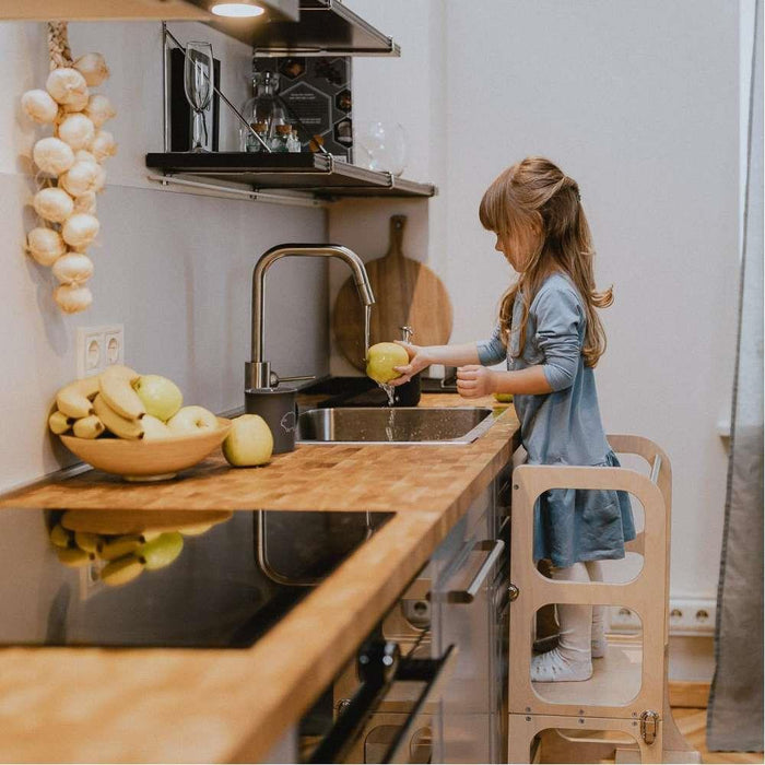 Multifuncional, a Torre de Aprendizagem convertível em mesa e cadeira oferece às crianças a possibilidade de participarem em atividades familiares de forma segura, a partir dos 18 meses, e, à posteriori, desenvolverem várias atividades confortavelmente sentadas e apoiadas, promovendo a sua autonomia. Com design simples, inspirado no conceito Montessori, pode ser utilizada em qualquer divisão da casa.