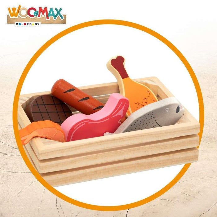 • Inclui 12 peças: 2 caixas, uma com frutas (laranja, maçã, melancia, banana e morango) e outra com proteínas (gamba, salsicha, filete, frango, hambúrguer e peixe).