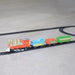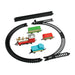 • O conjunto inclui: locomotiva vermelha com interruptor liga/desliga na lateral, 1 vagão de carvão, 1carruagem de passageiros, 1 vagão Blue Dairy, 4 peças de trilho pretas retas encaixáveis, 2 peças de trilhos semicirculares pretas de encaixe, 1 peça de trilho semicircular preta de encaixe com 2 conjuntos de pontos ferroviários (1 com interruptor)