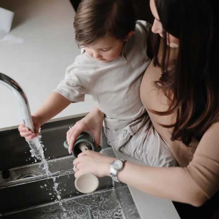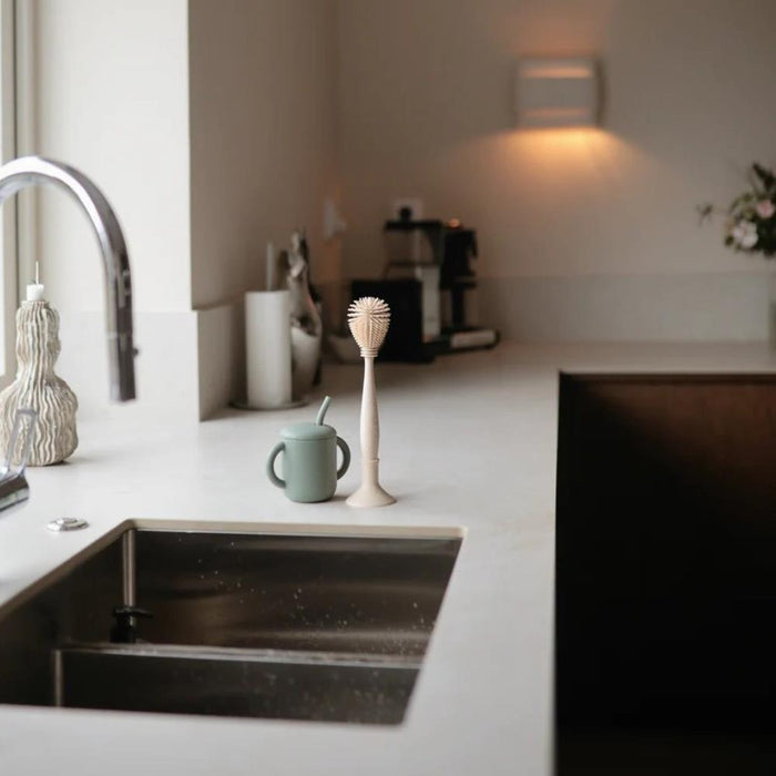 The 2-in-1 bottle brush will help you keep your baby’s feeding essentials clean. One side features a larger brush head with silicone bristles designed to effortlessly clean the inside of the bottle. The other side, in addition to a practical suction cup that serves as a base to keep the brush attached to various surfaces, has a smaller brush for precise cleaning of teats and other tight spaces.