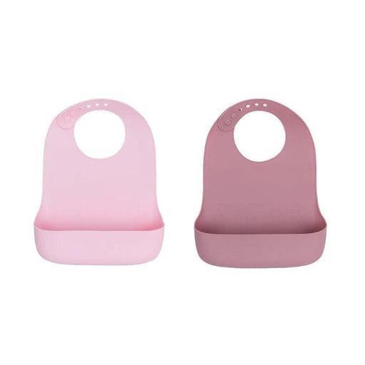 Set of 2 silicone bibs with practical front pocket and very comfortable fit for baby.
