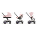 O PACK inclui: Carrinho e-Priam Chassis e Assento Rosegold, Pack de Tecidos Peach Pink, Cloud T Plus i-Size 45-87cm Peach Pink e Base Isofix T