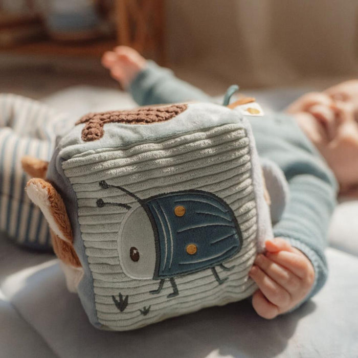 This super soft activity cube in soft tones will spark your child's curiosity. Each side is equipped with a different activity, with different textures and shapes that help develop their senses while keeping them entertained.