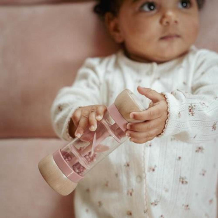 The transparent spinning wheel has colored beads inside that, when moved, emit a soothing sound, similar to that of raindrops.