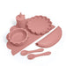 This set contains everything your baby needs at mealtime. Includes a stand, plate and bowl with suction cup, cup with lid and straw, spoon and fork and bib.