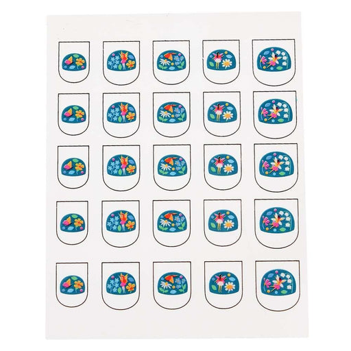 25 autocolantes para unhas, cada um com elementos "Fadas no Jardim".