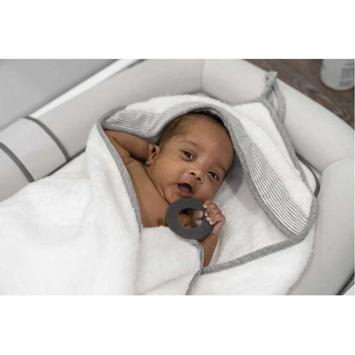 The Doomoo XL Bath Towel also serves as a bath apron for parents, protecting them from splashes. It has a hood and includes a ring/teether that kee...