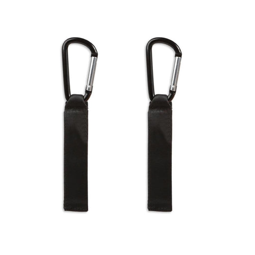 Conjunto de dois mosquetões que se prendem a qualquer barra guiadora de carrinho de passeio através de fitas de velcro, e permitem pendurar vários ...
