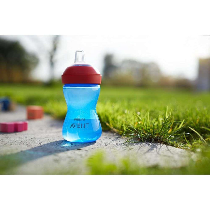 The learning cup with spout features an exclusive, spill-proof valve, non-slip texture and anatomical shape.