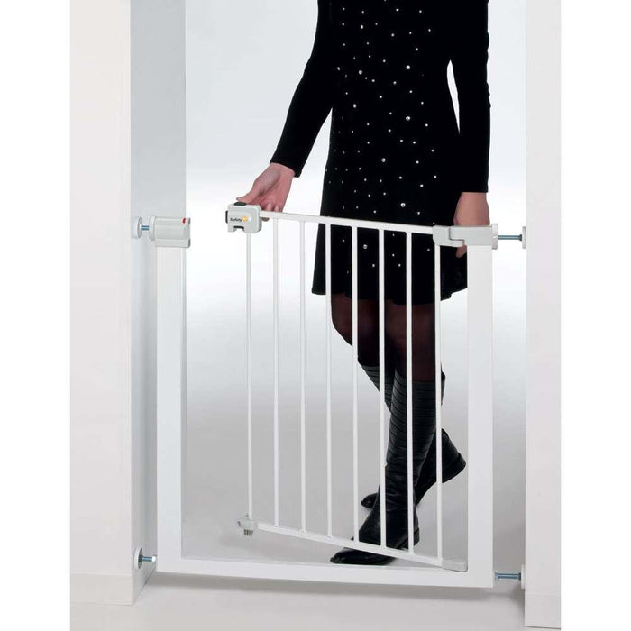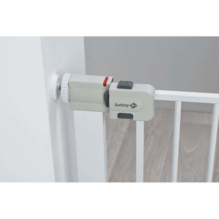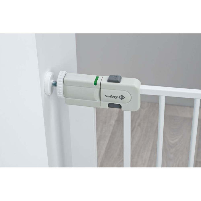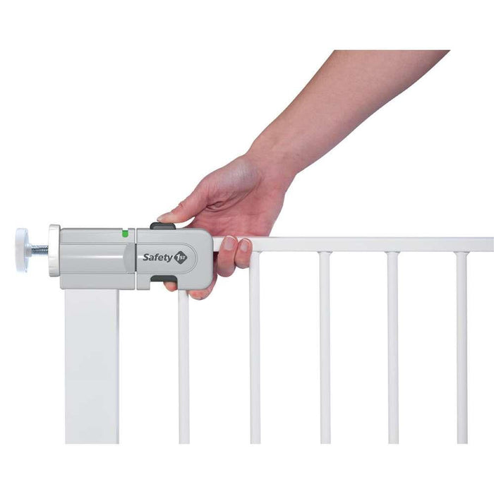 The Safety 1st SecurTech® self-closing metal barrier with visual indicator offers a smart, easy-to-use self-closing mechanism. Simply press the buttons on the handle to open it and let it close automatically. This barrier opens in both directions, is very convenient to use and can be extended up to 136 cm with extensions (sold separately).