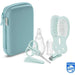 The hygiene set includes essential items for taking care of your baby's teeth, hair and nails in the first months of life. With a nasal aspirator with a soft and flexible tip, a finger toothbrush, a nail care set (round-tipped scissors, nail clippers and 3 files) and a hair care set consisting of a soft-bristled brush and comb, you can keep everything organised and always at hand in the practical carrying case with dividers.