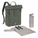 This backpack is sustainably produced, made from 100% recycled polyester fabric with its practical diaper changing accessories, it impresses with its simple silhouette, sustainability and extra space. The sustainably produced vegan diaper backpack provides flexibility thanks to its rolltop-style opening. Once you've finished packing it and found something else you need, just open the top and there's extra space, especially for long items - so no hassle! The volume of the backpack can be increased from 17.5 to up to 21.8 liters by simply unrolling the top. When rolled up, the backpack closes with a simple magnetic clasp. Features You have quick access to the interior with the zip along the entire length of the side. A pouch on the front, a zipped pocket on the back and practical accessories make it the ideal accessory for parents. Equipped with a water-repellent changing mat, an isothermal bottle holder, removable bottle holder, accessories for the stroller and a small utensil bag, it has everything you need when you're out and about. The different practical compartments, accessible from the inside and outside, help you store your utensils however you want. Clean with a damp cloth Technical information Measurements: 30 x 14.5 x 46 cm Lining: 100% recycled polyester Material: 100% polyester (made from recycled material) Capacity: 17.5 l (rolled twice), 20.8 l (rolled once) Weight: 0.96 kg