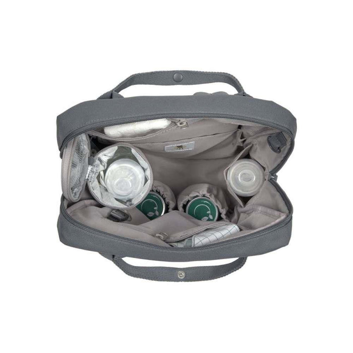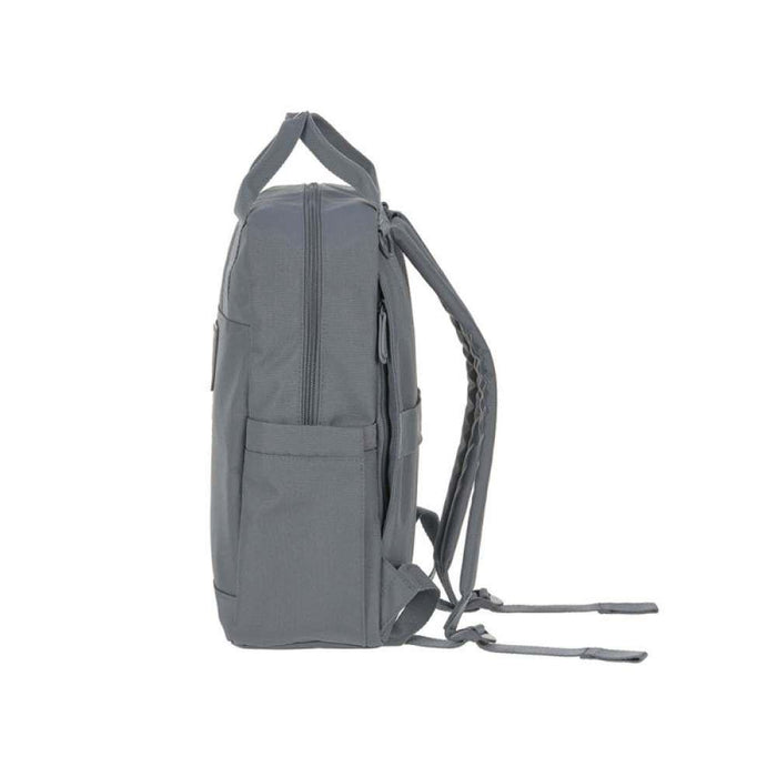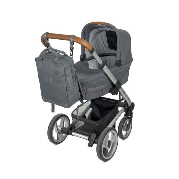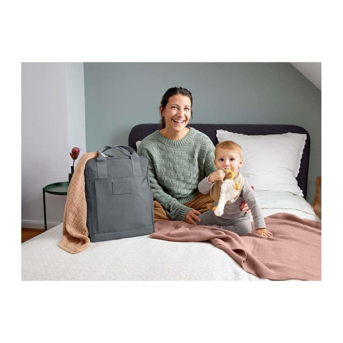 This backpack is sustainably produced, made from 100% recycled polyester fabric with its practical diaper changing accessories, it impresses with its simple silhouette, sustainability and extra space. The sustainably produced vegan diaper backpack provides flexibility thanks to its rolltop-style opening. Once you've finished packing it and found something else you need, just open the top and there's extra space, especially for long items - so no hassle! The volume of the backpack can be increased from 17.5 to up to 21.8 liters by simply unrolling the top. When rolled up, the backpack closes with a simple magnetic clasp. Features You have quick access to the interior with the zip along the entire length of the side. A pouch on the front, a zipped pocket on the back and practical accessories make it the ideal accessory for parents. Equipped with a water-repellent changing mat, an isothermal bottle holder, removable bottle holder, accessories for the stroller and a small utensil bag, it has everything you need when you're out and about. The different practical compartments, accessible from the inside and outside, help you store your utensils however you want. Clean with a damp cloth Technical information Measurements: 30 x 14.5 x 46 cm Lining: 100% recycled polyester Material: 100% polyester (made from recycled material) Capacity: 17.5 l (rolled twice), 20.8 l (rolled once) Weight: 0.96 kg