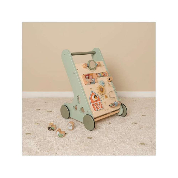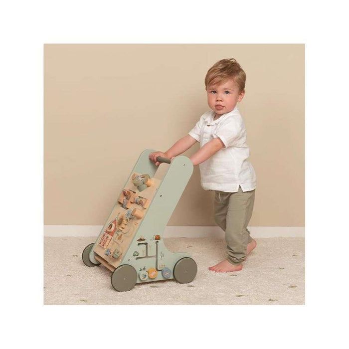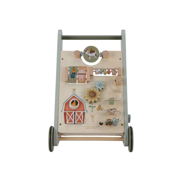 Walk, play and learn! This wooden walker offers several challenging activities that support the development of your child's motor skills.