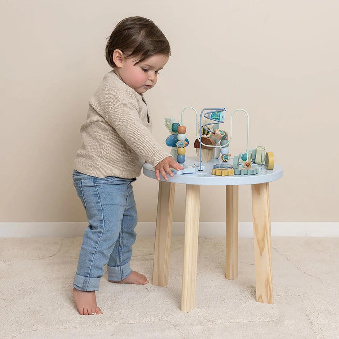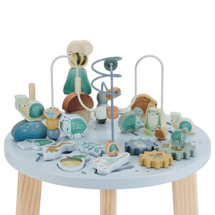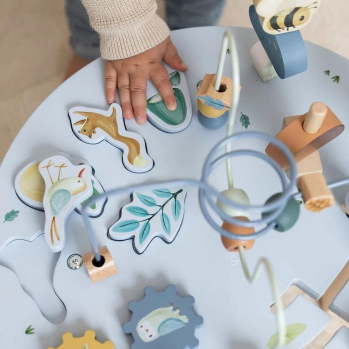 This activity table challenges your child to discover the world around them through fun and intuitive games, such as: taking the beads along the spiral, from one side of the enchanted forest to the other, building a tower, putting the shapes in the right places, turning the gears and helping the adorable animals cross the forest.