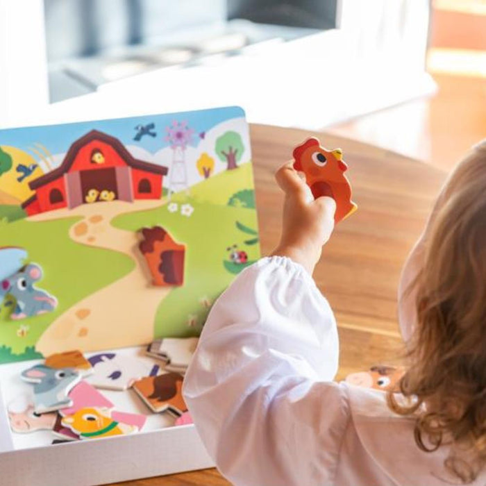 Com este puzzle magnético o seu filho pode replicar as imagens dos cartões, colocando os imanes no local indicado, ou usar a sua imaginação para fazer novas composições. Há infinitas combinações que garantem muita diversão ao mesmo tempo que encorajam o desenvolvimento vocabulário.