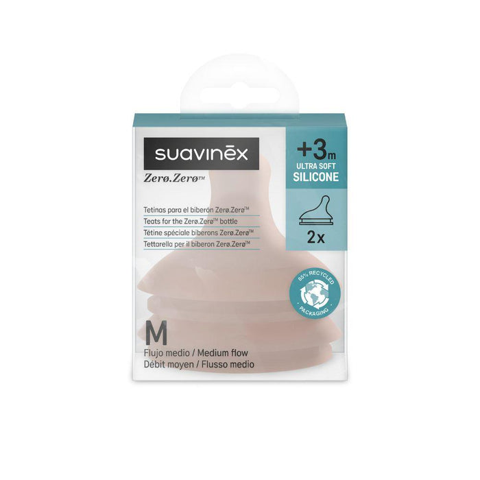 Com um design baseado em estudo científico que recria condições semelhantes à amamentação natural em termos de cor (tetina/peito), aderência, esforço e sucção, as tetinas Suavinex Zero Zero são recomendadas, particularmente, para quem faz uma lactação mista. O fluxo M (Médio) é indicado para líquidos de densidade média: leite, sumos e papas muito líquidas.