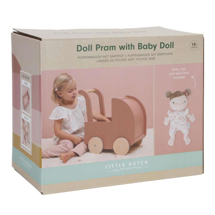 Coche de juguete con muñeca rosa, almohada, manta y sábana.