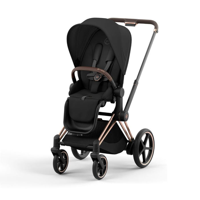Cochecito e-Priam con chasis y asiento Rosegold + Pack de tejido Sepia Black + Capazo Priam Lux Sepia Black + Cloud T Plus Sepia Black