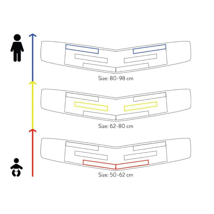 • Guias de velcro ajustáveis à medida que o seu bebé cresce, indicam a largura ideal do assento