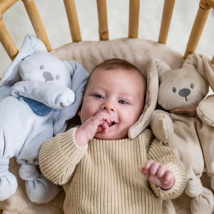 El peluche Conejo Lapidou con bufanda ofrece innumerables posibilidades de agarre y, por tanto, favorece el desarrollo del sentido del tacto y de la motricidad de tu bebé. El material extra suave proporciona una sensación reconfortante desde los primeros días de vida.