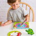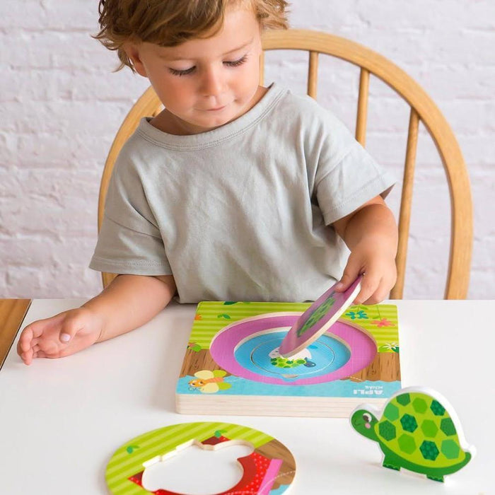 El rompecabezas en capas presenta el ciclo de vida de una tortuga. Al principio veremos un huevo, del cual nacerá el animal, y fase tras fase se irá transformando en una tortuga adulta. Mientras juegan, los niños ejercitan su memoria, concentración y desarrollan habilidades visuales y espaciales.