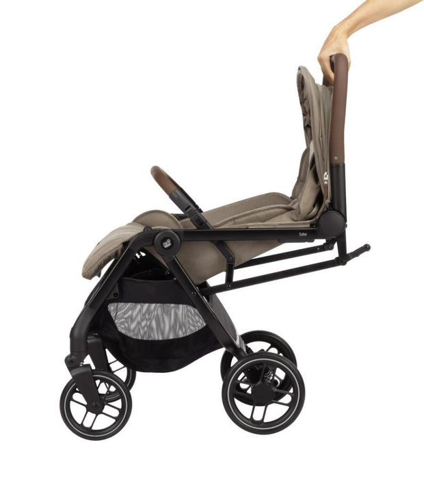 Sencillo de maniobrar, el cochecito Soho te permite moverte por la ciudad sin ninguna dificultad. Su cierre automático, con una sola mano, y su posición vertical (cuando está cerrado) proporciona un almacenamiento compacto incluso en espacios reducidos. Las grandes ruedas a prueba de pinchazos garantizan un mayor confort, al igual que el asiento acolchado con tres posiciones reclinables.