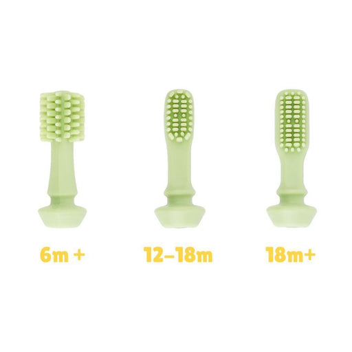 Recomendado por los expertos como el primer cepillo de dientes que utilizan los bebés. Fabricado 100% en silicona, tiene diferentes terminaciones que podemos utilizar tanto para la higiene bucal como para masajear las encías de tu hijo para paliar la llegada de sus primeros dientes.