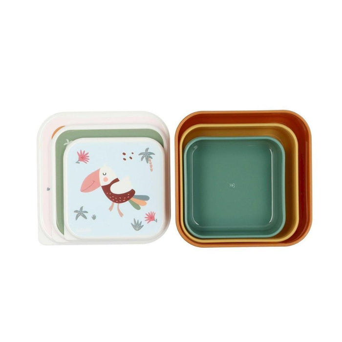 Set de tres cajas con tapa, con diferentes colores e ilustraciones, para llevar a cualquier parte. Cada caja tiene un tamaño diferente y se pueden guardar una dentro de la otra. Ideal para llevar la comida por separado, en mochila o lonchera.