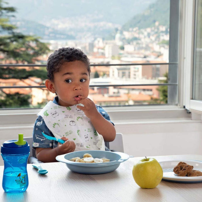 ¡Con dos platos, un vaso con pajita, una cuchara y un tenedor, este juego le permite a tu hijo ganar independencia durante la hora de la comida!
