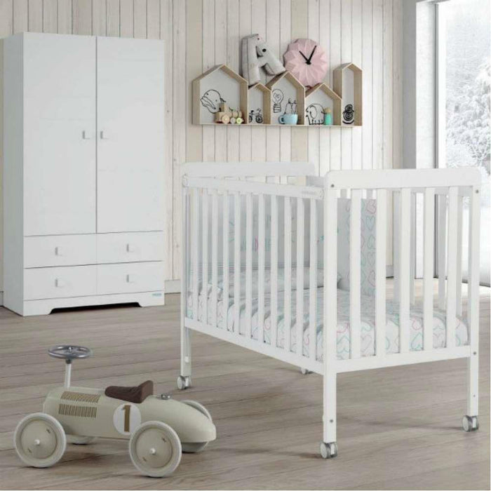 Uma cama com 5 posições e lateral móvel, minimalista, que encaixa em qualquer decoração de quarto de bebé.