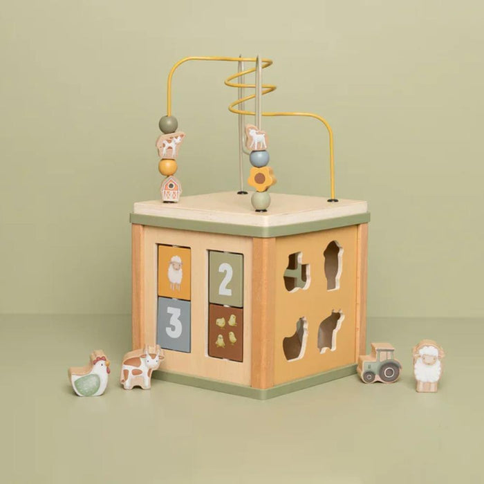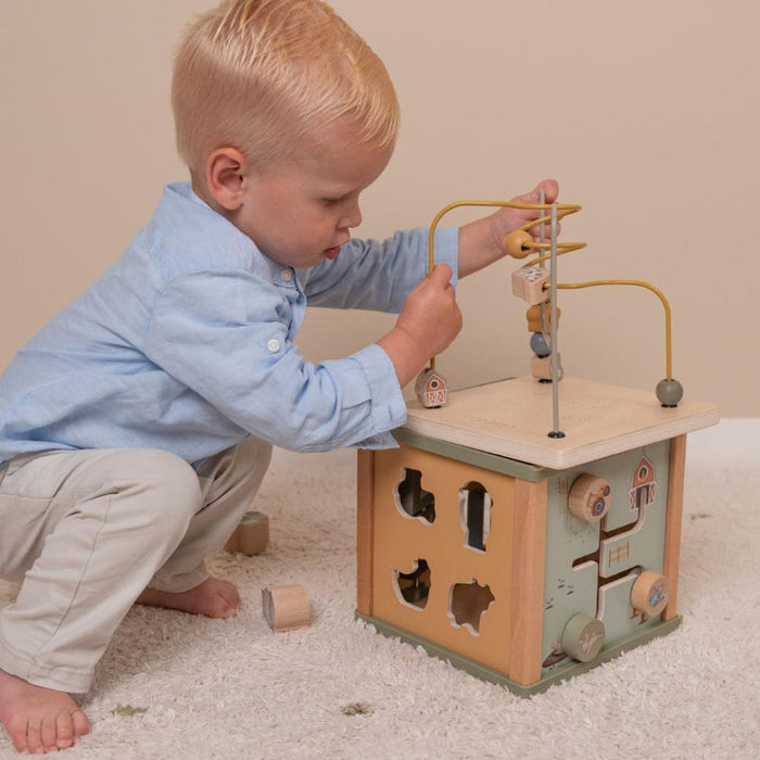 Este cubo de atividades oferece vários desafios àss crianças. Cada lado oferece uma atividade educacional diferente, incluindo um classificador de formas, engrenagens giratórias, quebra-cabeças e uma divertida espiral de contas no topo. Indicado para desenvolver as habilidades motoras finas do seu filho e encorajar a sua criatividade.