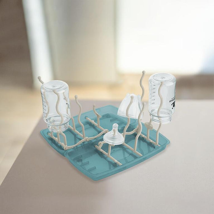 Prático e funcional este escorredor, com bandeja de armazenamento de água, conta com vários suportes (de ponta arredondada) para biberões, chupetas e tetinas. Sobrável, ocupa pouco espaço quando não está a uso.