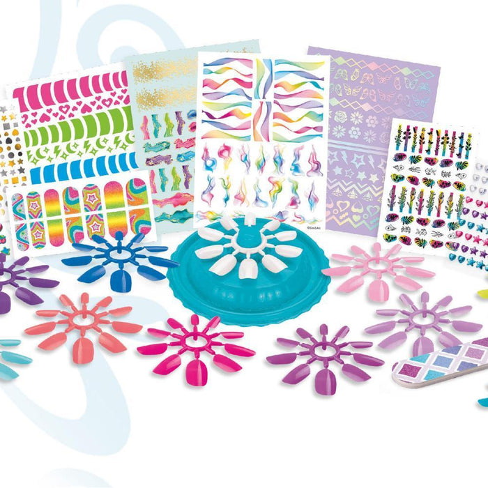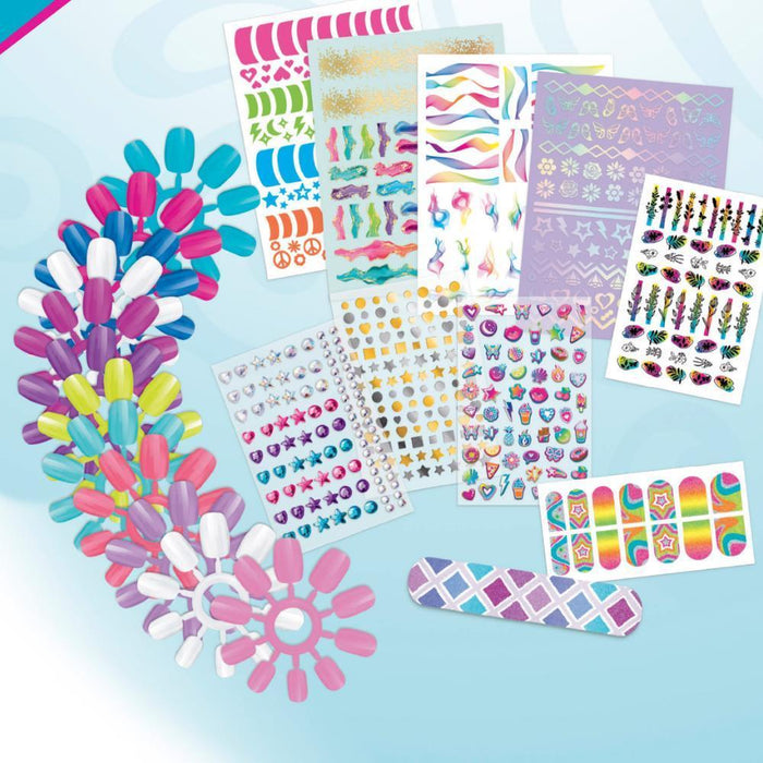 Crie designs de unhas espetaculares com o completo estúdio de unhas Shimmer ''n Sparkle. Com 168 autocolantes adesivos, pedras preciosas e mais acessórios para uma experiência divertida e criativa. Utilize o tabuleiro para planear o seu design, misture e combine autocolantes, decalques e tatuagens para criar uma manicure de salão em minutos. Adicione pedras preciosas para um acabamento brilhante e as suas unhas estão prontas para deslumbrar!