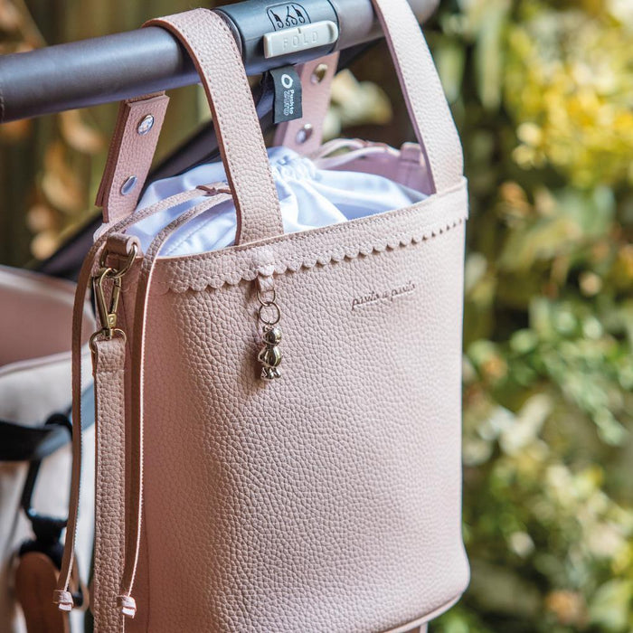 Para usar à tiracolo ou pendurada no carrinho de passeio graças às duas alças pequenas, esta bolsa conta com um interior espaçoso para colocar todos os vossos essenciais e tê-los sempre à mão e fáceis de encontrar. Fabricada em polipele resistente, o seu formato redondo e fecho com cordão, ajustável, oferece organização e praticidade.