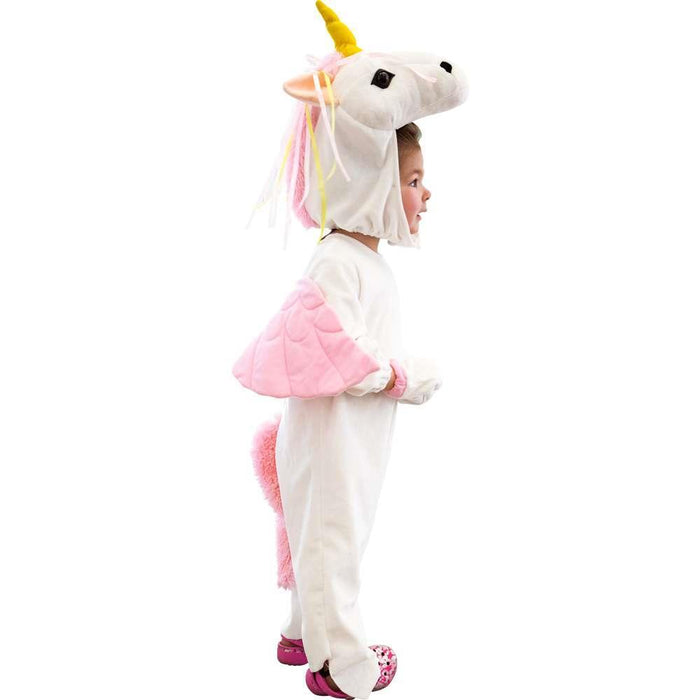 Com asas cor-de-rosa, fitas na crina cor-de-rosa e um corno amarelo.